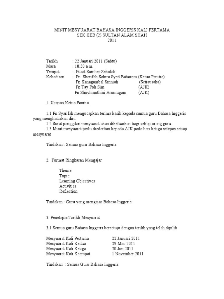 Meeting Minutes Minit Mesyuarat In English / Pdf Pencelahan Dalam Mesyuarat Di Tempat Kerja Interruptions In Workplace Meetings. Contextual translation of minit mesyuarat into english. English unit meeting minutes 1/2015 sk kuala matu, matu date : Computer room, sk kuala matu present : The confirmation of the last minute was proposed by mdm. Hyrull ann bt alwi and seconded by mr. Minit, minute, minuite, meeting, mesyuarat, minutes of meetings.